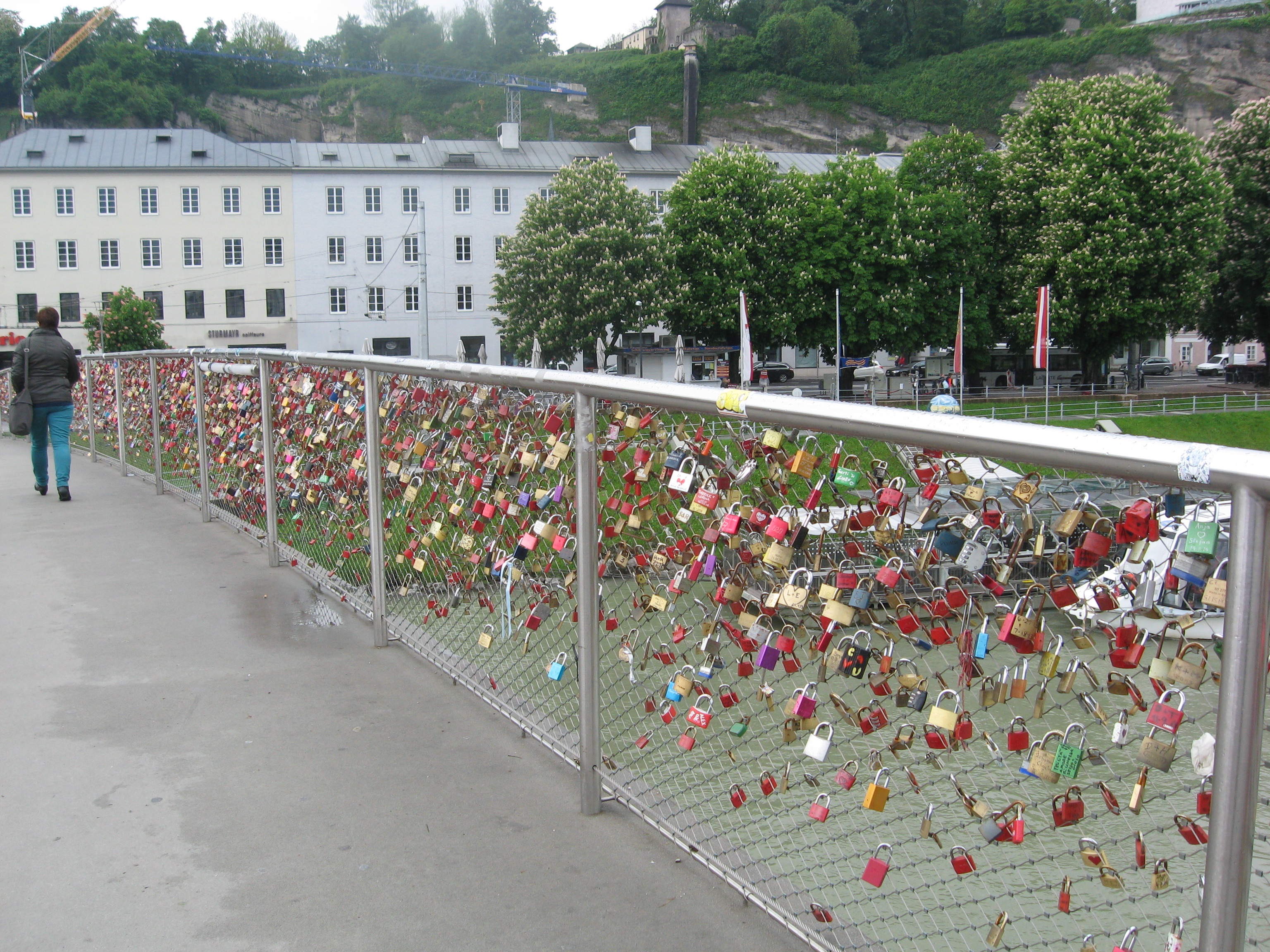 Sated, we walked at a gentle pace towards the old town. We crossed the Salzach River on the Market footbridge, adorned these days with little padlocks on which love messages have been written. (Some shops sell painted red padlocks, ready for immediate use!) This set the tone for what has become of the old town since I saw it in 1982 – it has been boutiqued, overrun by retailers of everything from Louis Vuitton to kitsch to hamburgers – and the streets are filthy with shoppers. The time warp feeling was amplified by the staging of a marathon foot race, with its finishing line in the heart of the old town; this did have the upside of colourful entertainers!