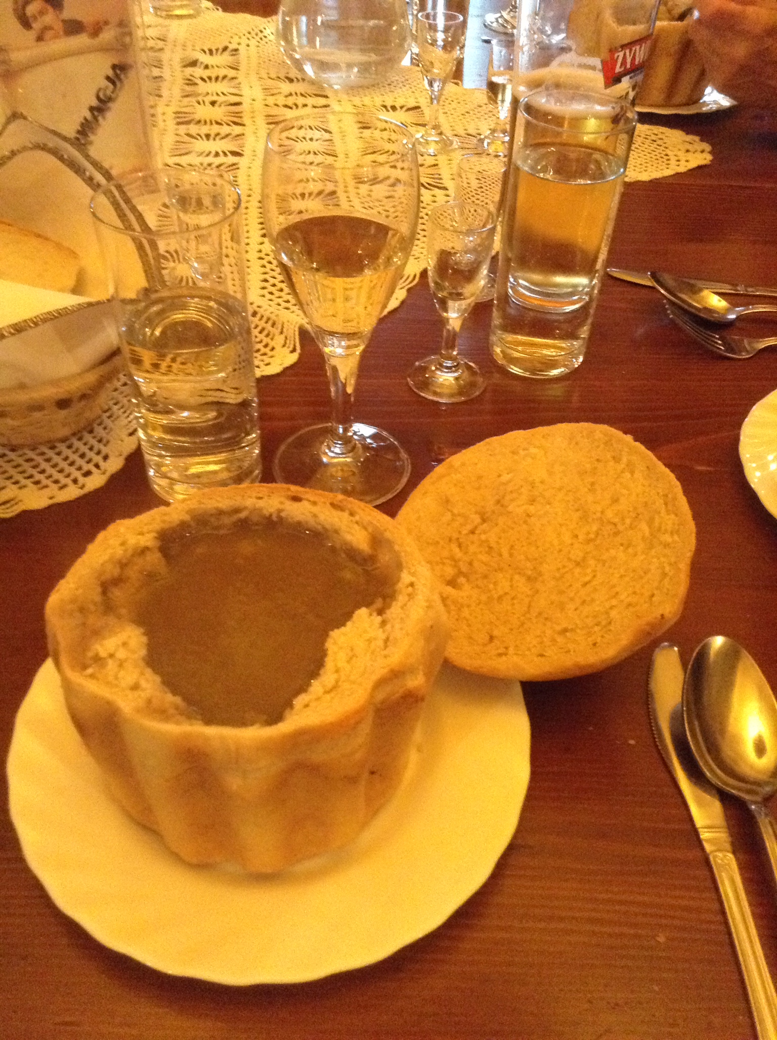 Another Polish tradition which we enjoyed while we were in Krakow was a rich, tasty soup made with wild mushrooms. It is served with a purpose-baked loaf of bread that is hollowed out to make room for the soup.