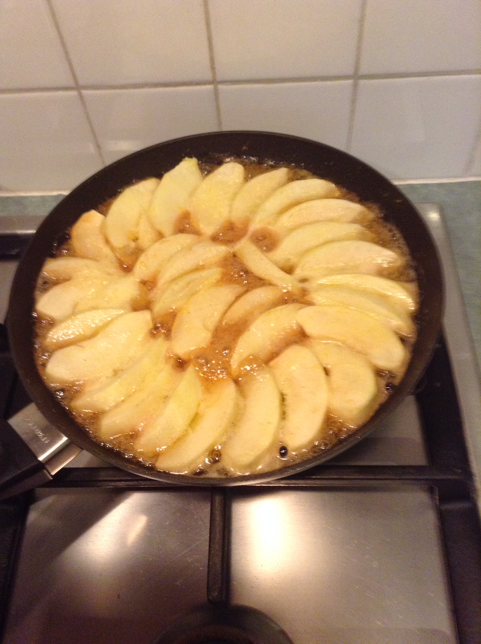 The main ingredients for success in this dish are patience and care while cooking the wedges of apple in the caramel of butter, sugar and orange juice. We put the pan over a simmer mat, which spreads the heat more widely when cooking with gas. The first two photos show how the apple shrinks a little and, more importantly, the caramel slowly darkens.