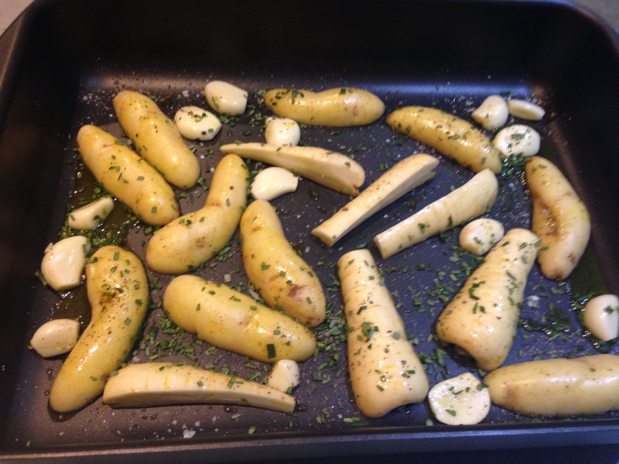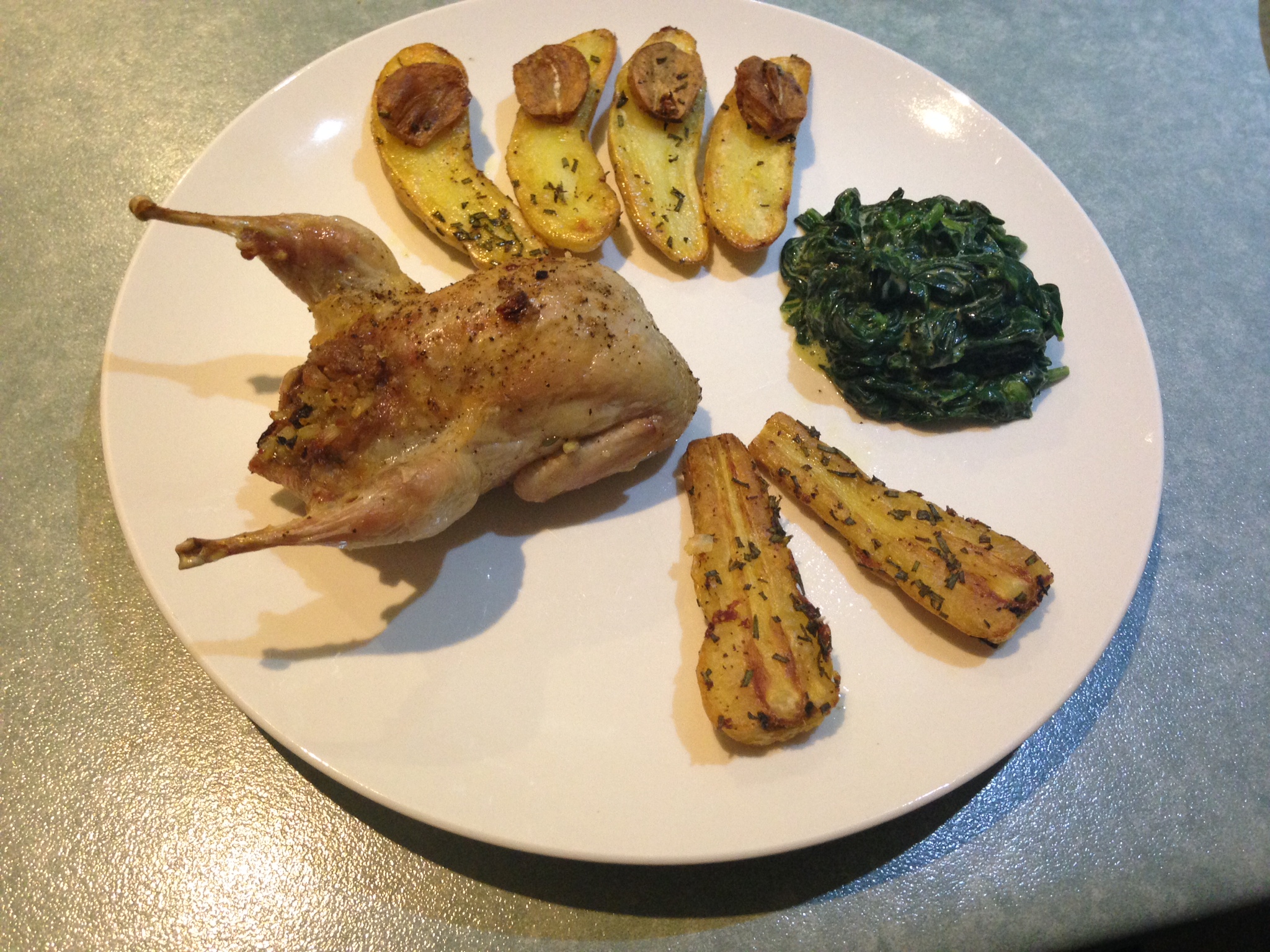 To accompany the quail, we roasted some well-seasoned pieces of kipfler potato and parsnip with olive oil, garlic and chopped rosemary leaves; and we wilted a bunch of spinach leaves and mixed them with Dijon mustard and cooking cream.