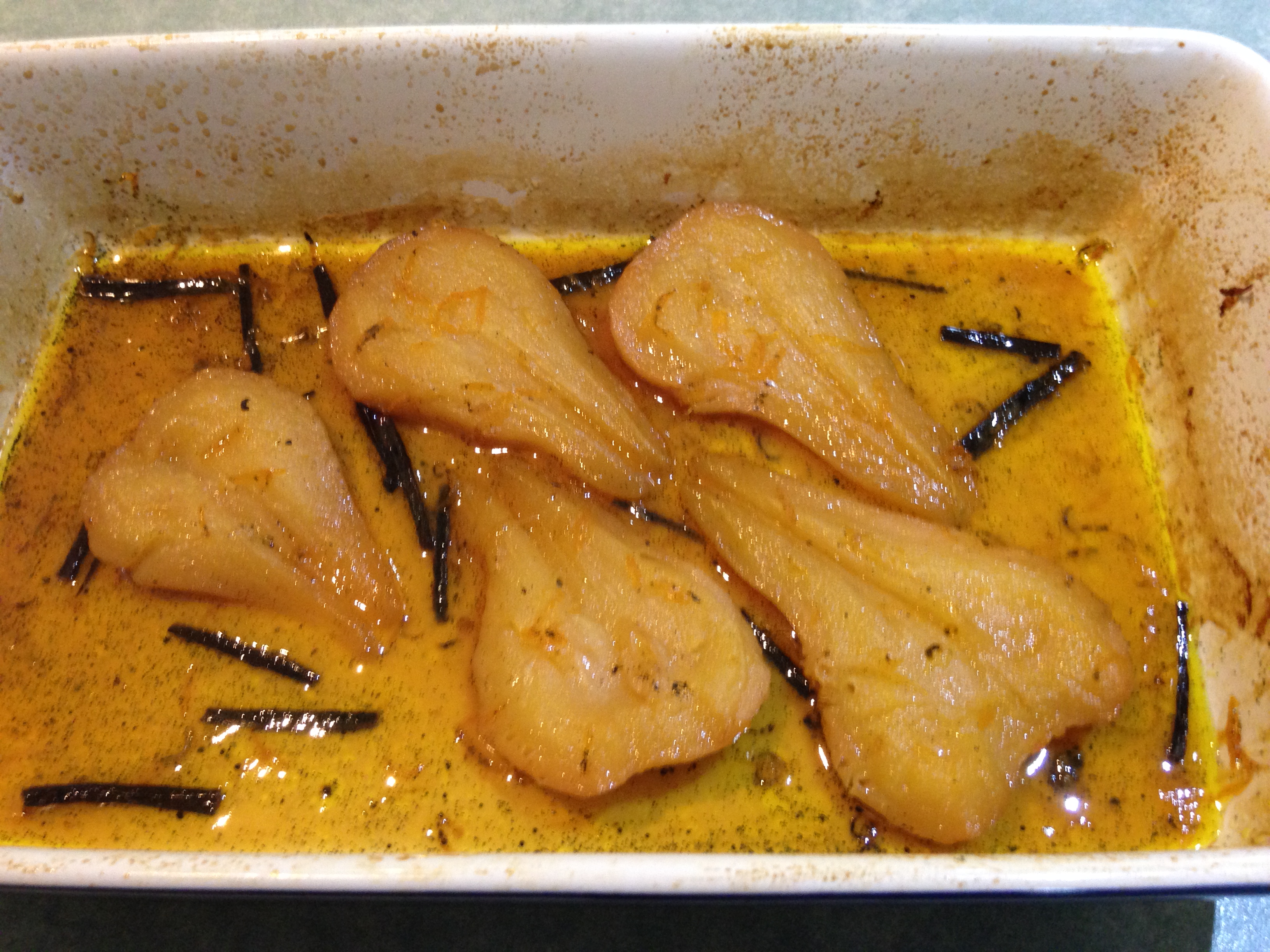 - Place in the oven and cook for 1-1¼ hours, turning the pear halves after 35-40 minutes. Remove the foil and bake uncovered for another 20 minutes or so. When the pears are starting to turn golden brown and the cooking juices have reduced to a thick syrup, they are ready.