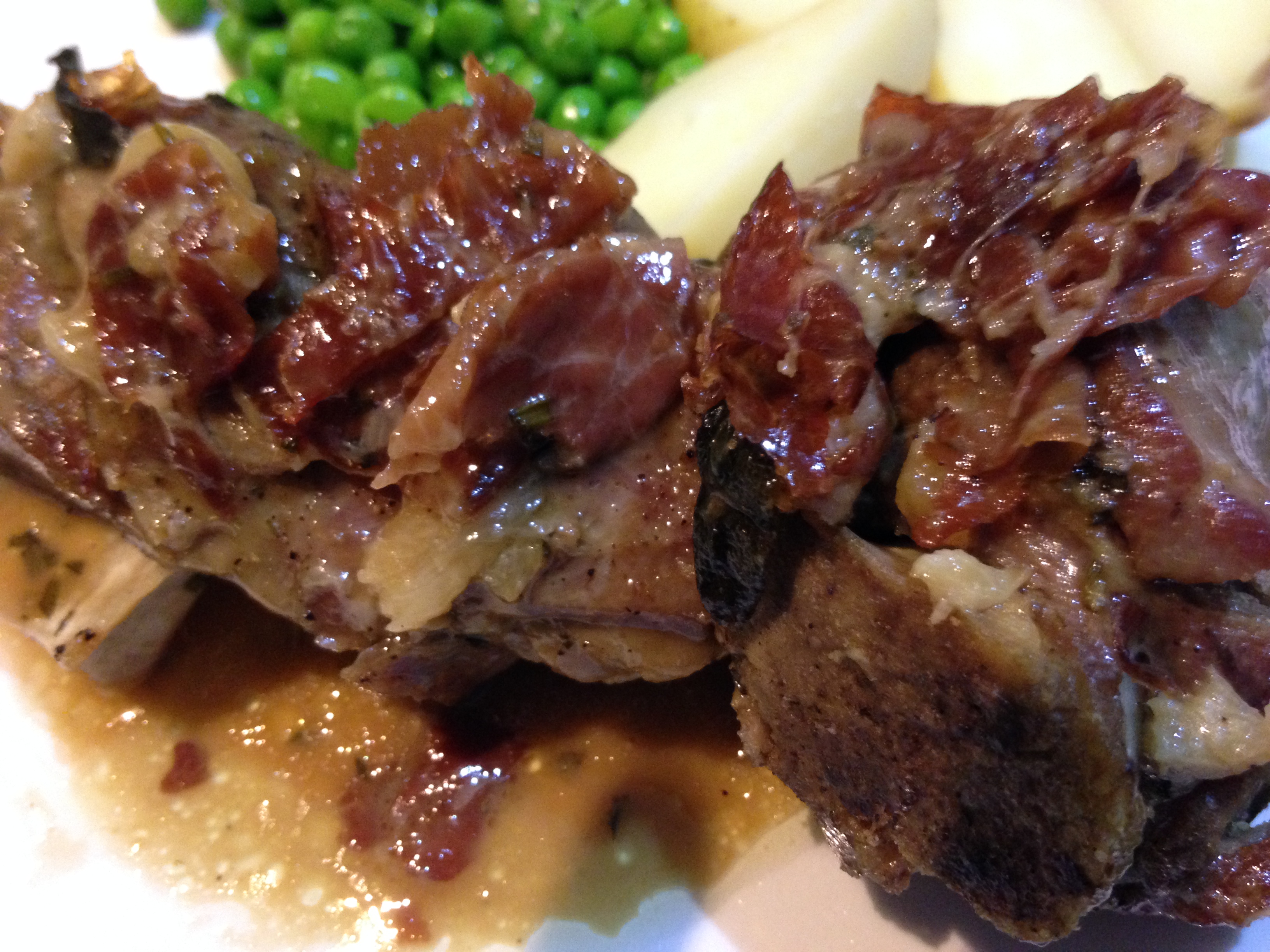A meal of goat requires a few hours of preparation and cooking. After two weekends out of town, that window of opportunity came last Saturday. Much as we had enjoyed the recipe we used in August, we chose to do a pot-roast this time, adapting the recipe for an Italian lamb dish known as Abbacchio alla romana. The lamb dish is traditionally made using shoulder pieces. This produces a very tasty result which is also incredibly sticky, from the rendered lamb fat; we now use jointed lamb shanks, to achieve a less tactile experience!