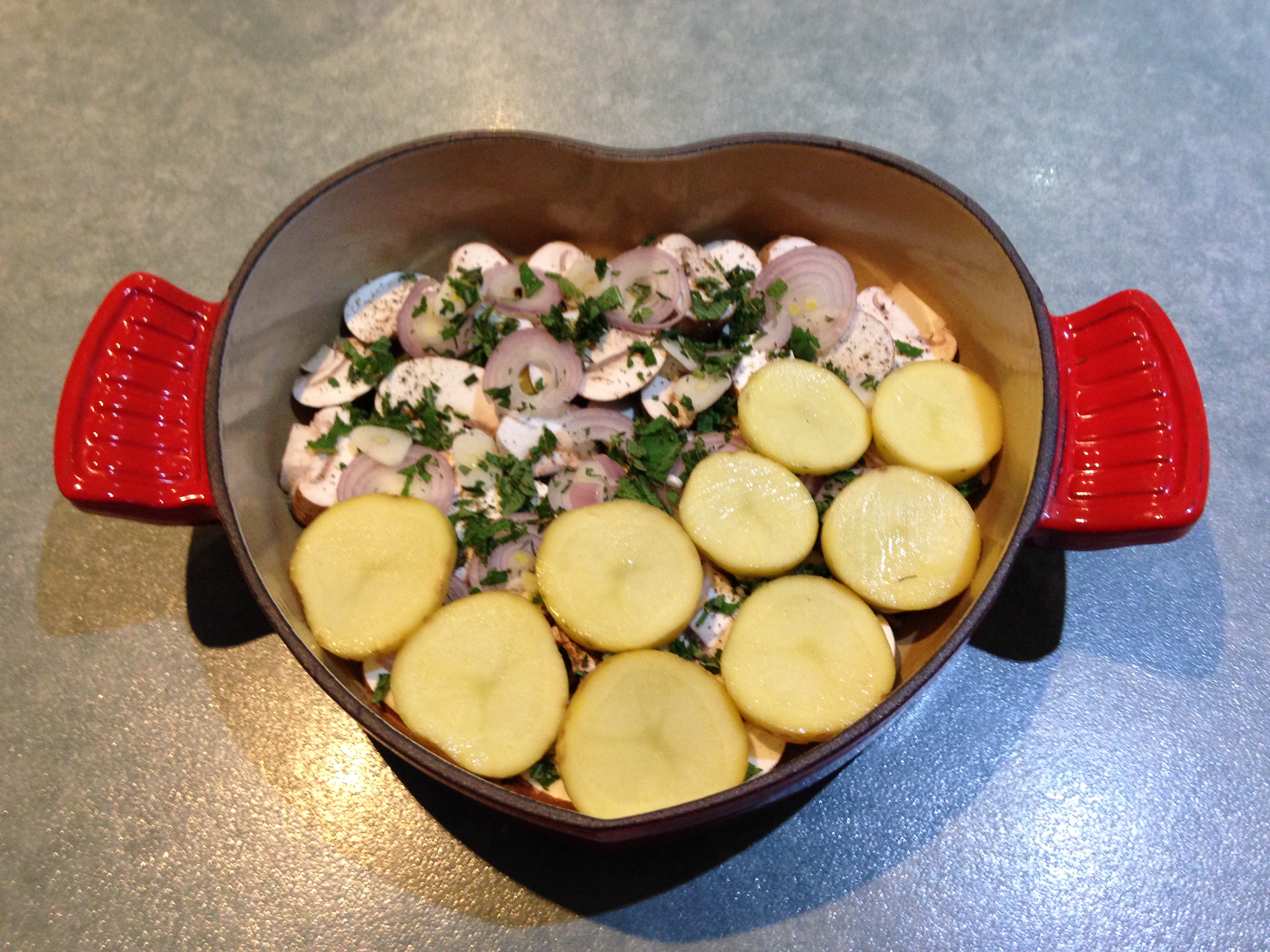 The photos below show the involtini after the cooking was finished and a side dish of garlic, mushroom, brown shallot and potato slices, scattered with extra herbs, seasoning and olive oil. We also prepared a salad of young spinach leaves, toasted walnuts and vinaigrette dressing.