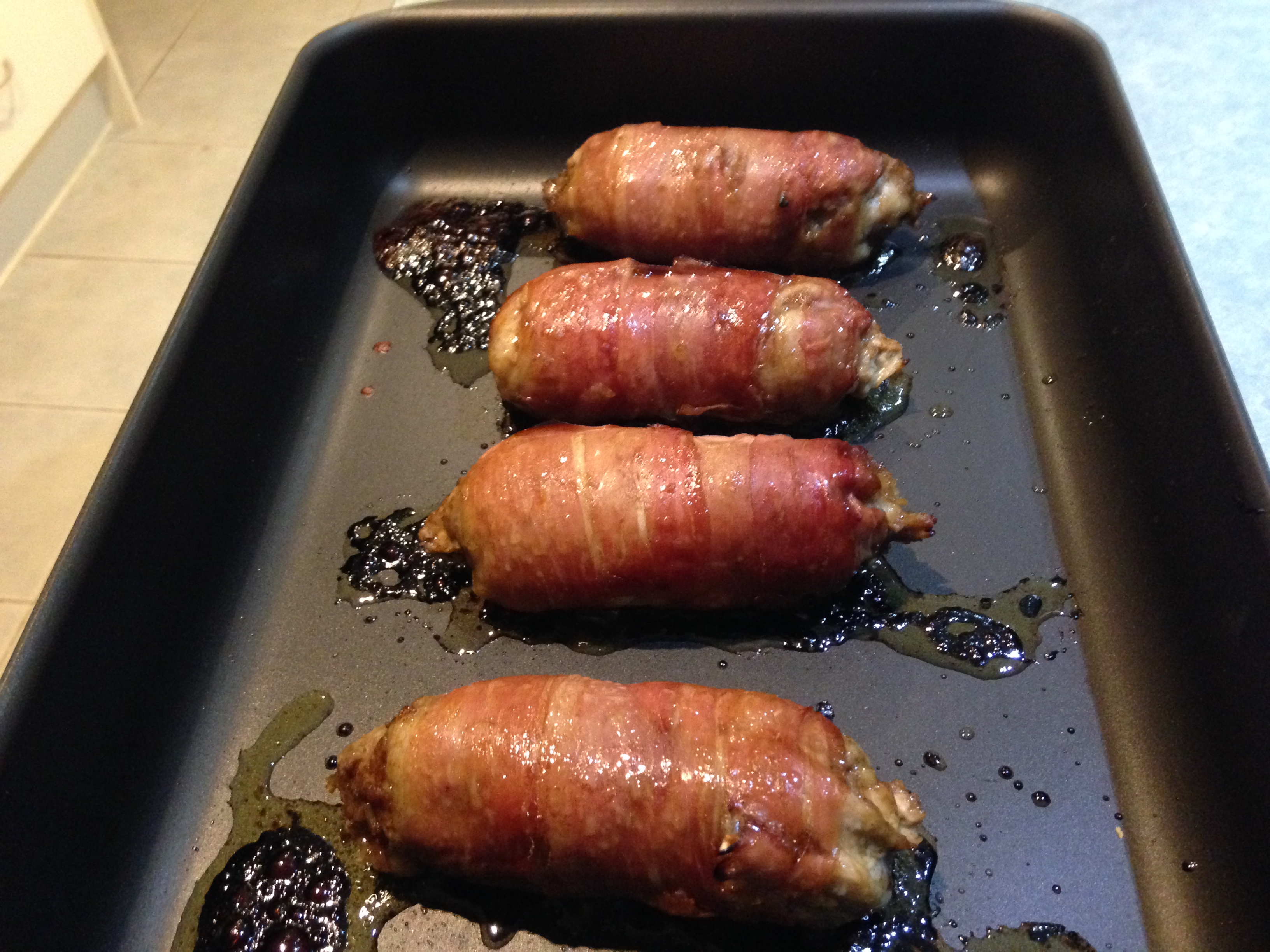 - Place all four ‘bonbons’ on a baking tray and place them in the oven for 15 minutes. Remove the tray from the oven and carefully remove the foil; place the rolled quail back on the tray.