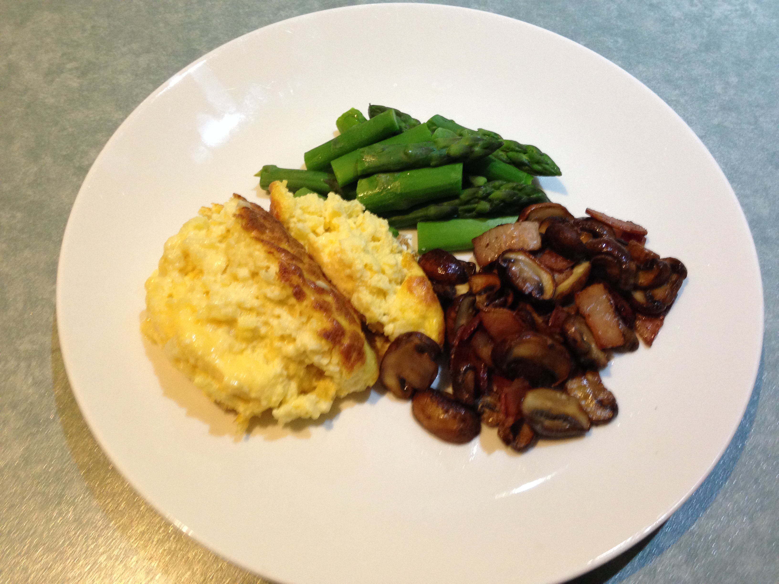 We served the soufflé with lightly-boiled fresh asparagus – in peak season right now – and a mixture of bacon and mushrooms.
