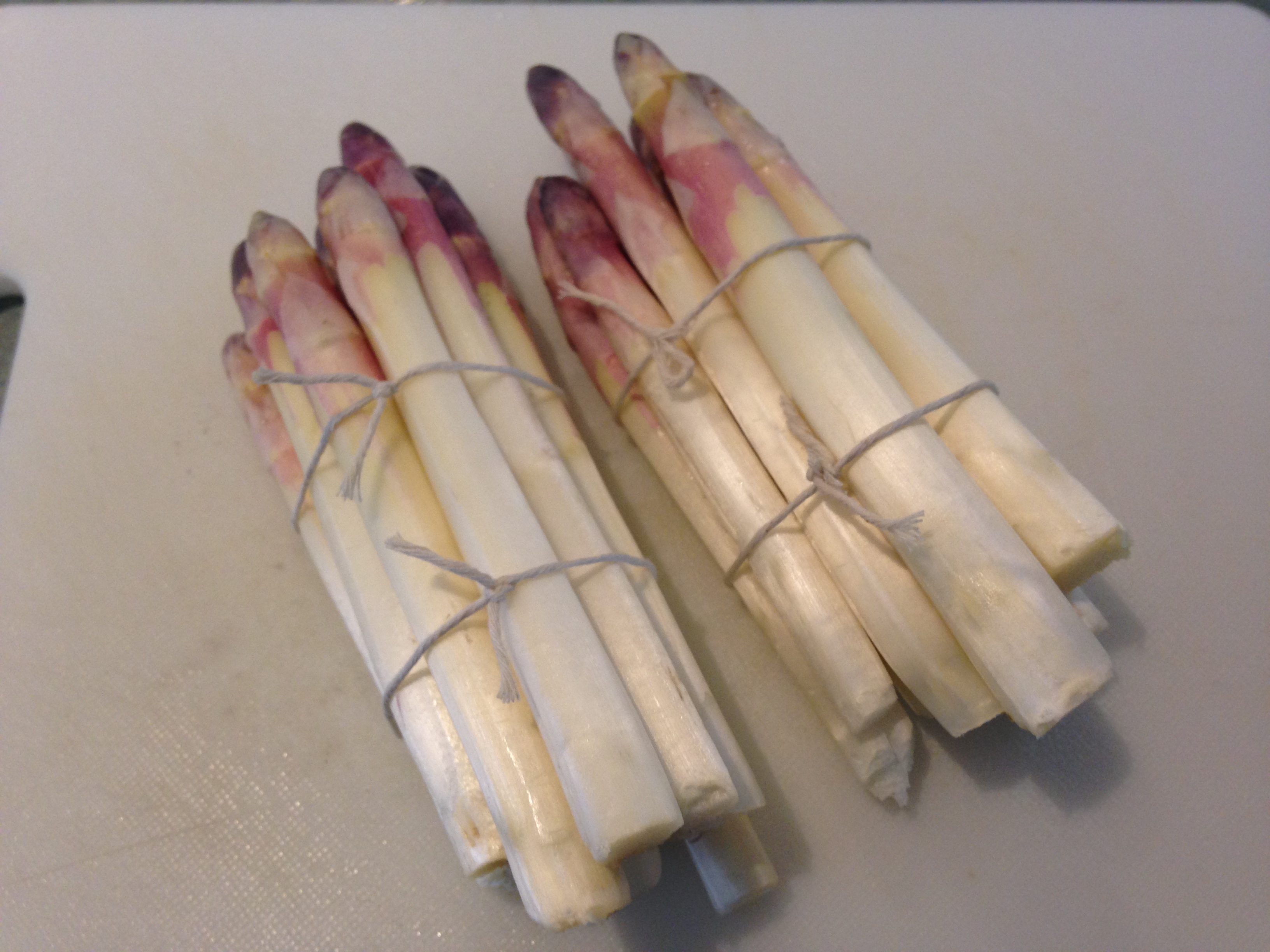 Last Saturday, we went to the Farmers’ Market held at the wonderful Collingwood Children’s Farm on the second Saturday of each month. It took us just 45 minutes to fill our double-decker shopping cart with a bounty of fresh produce, including two bunches of white asparagus.