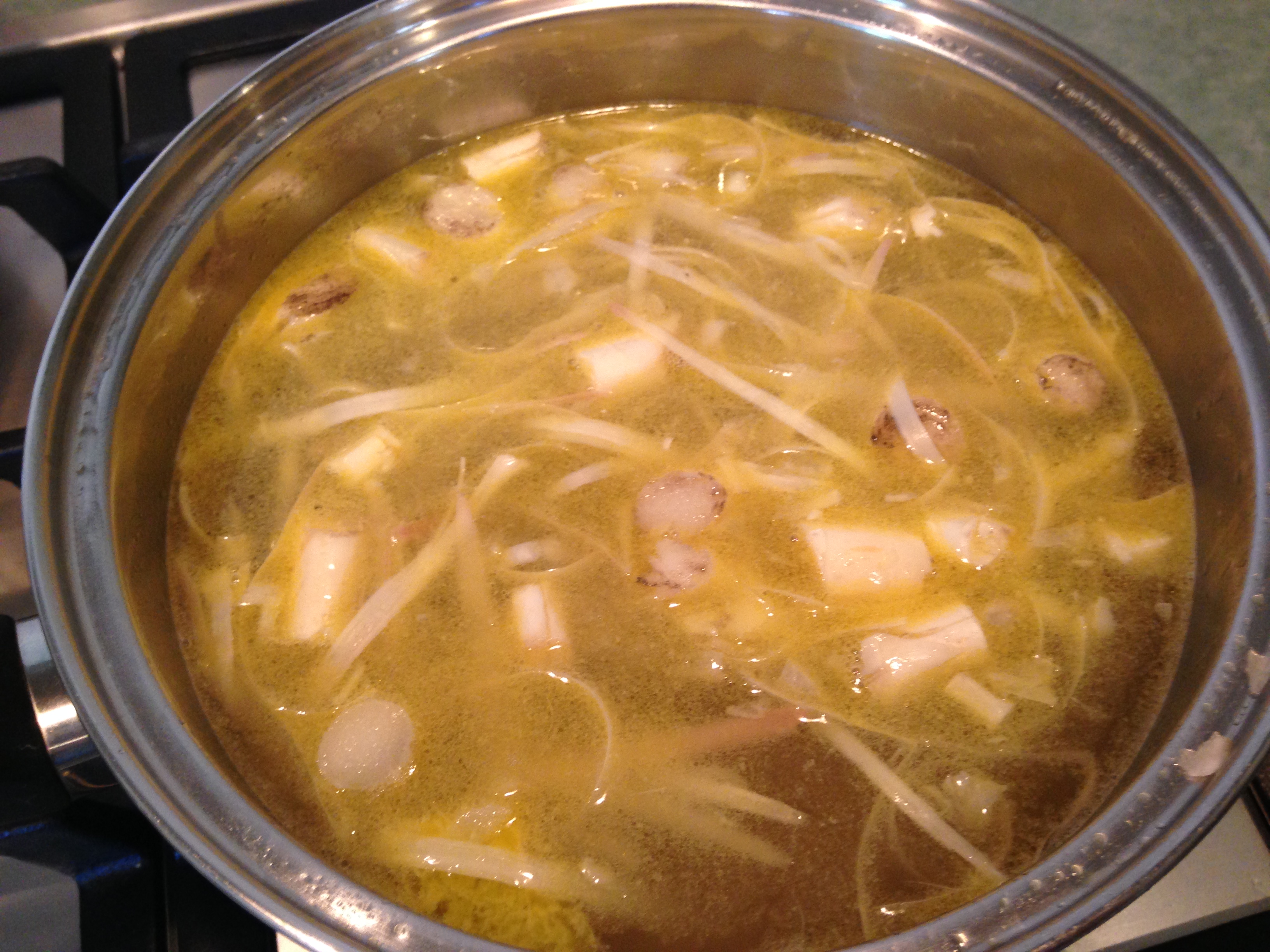 - Add the remaining 80g of butter to the original pan and melt it over low-to-medium heat. Add the flour and cook for just over a minute. Add the stock ½ a cup at a time, stirring constantly with a whisk to keep the soup smooth. Simmer for 10 minutes to thicken the soup.