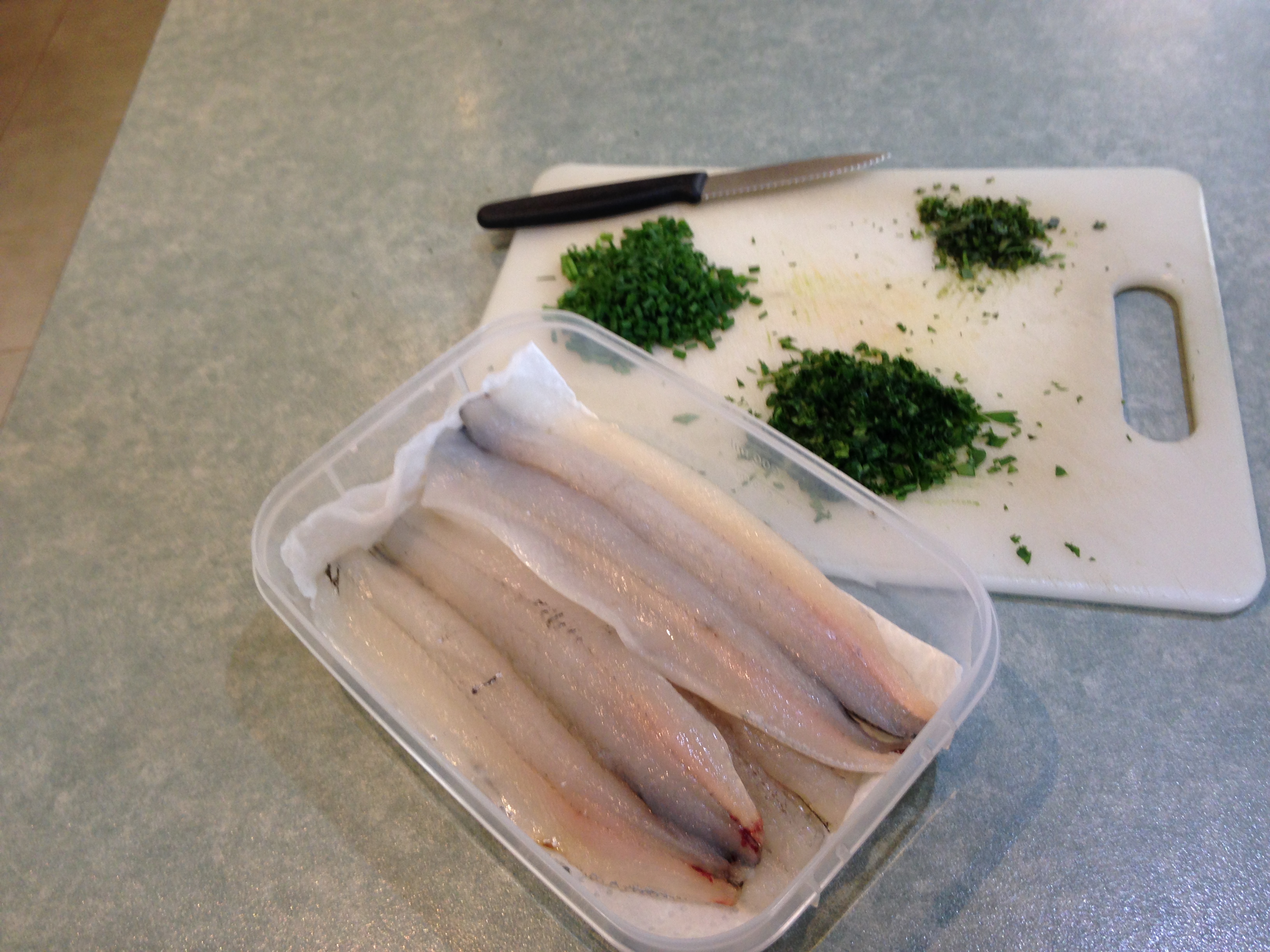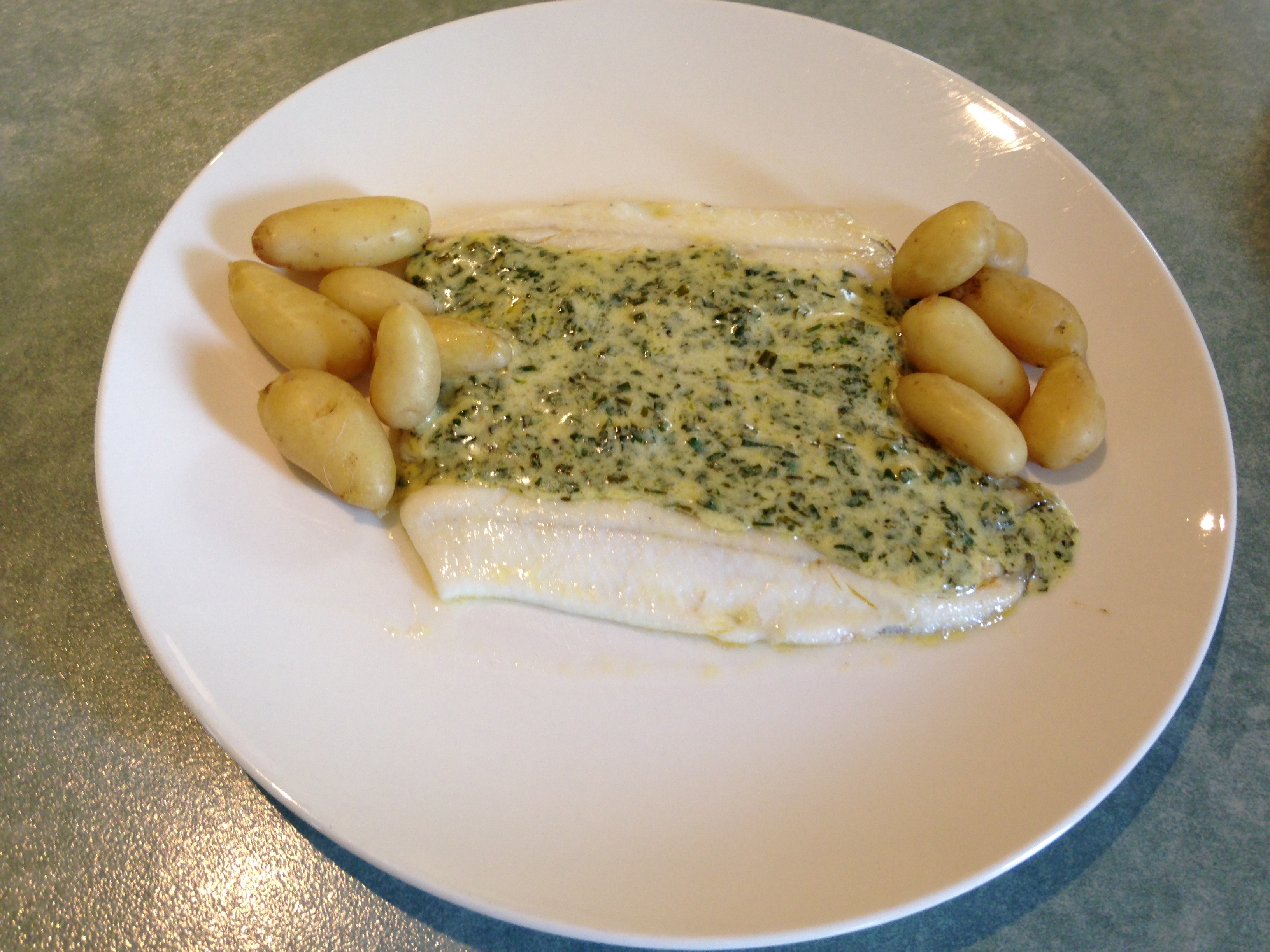 I prepared them for a light Saturday lunch in a meuniere style – a knob of unsalted butter, no oil, melted in a pan over medium heat, cooked skin-side up then a scant minute on the skin. The fillets were transferred to two plates in an oven heated to 75C then turned off.