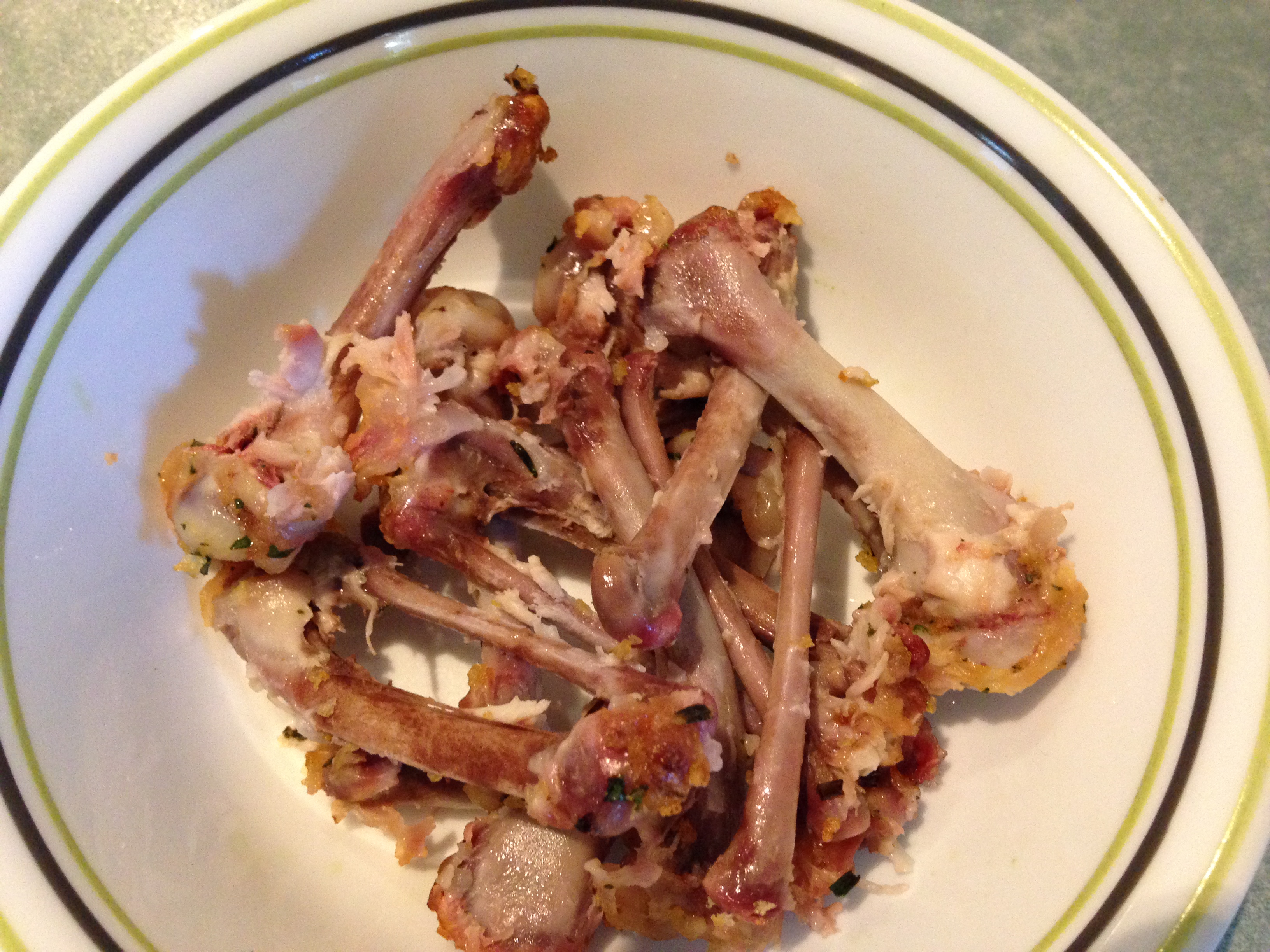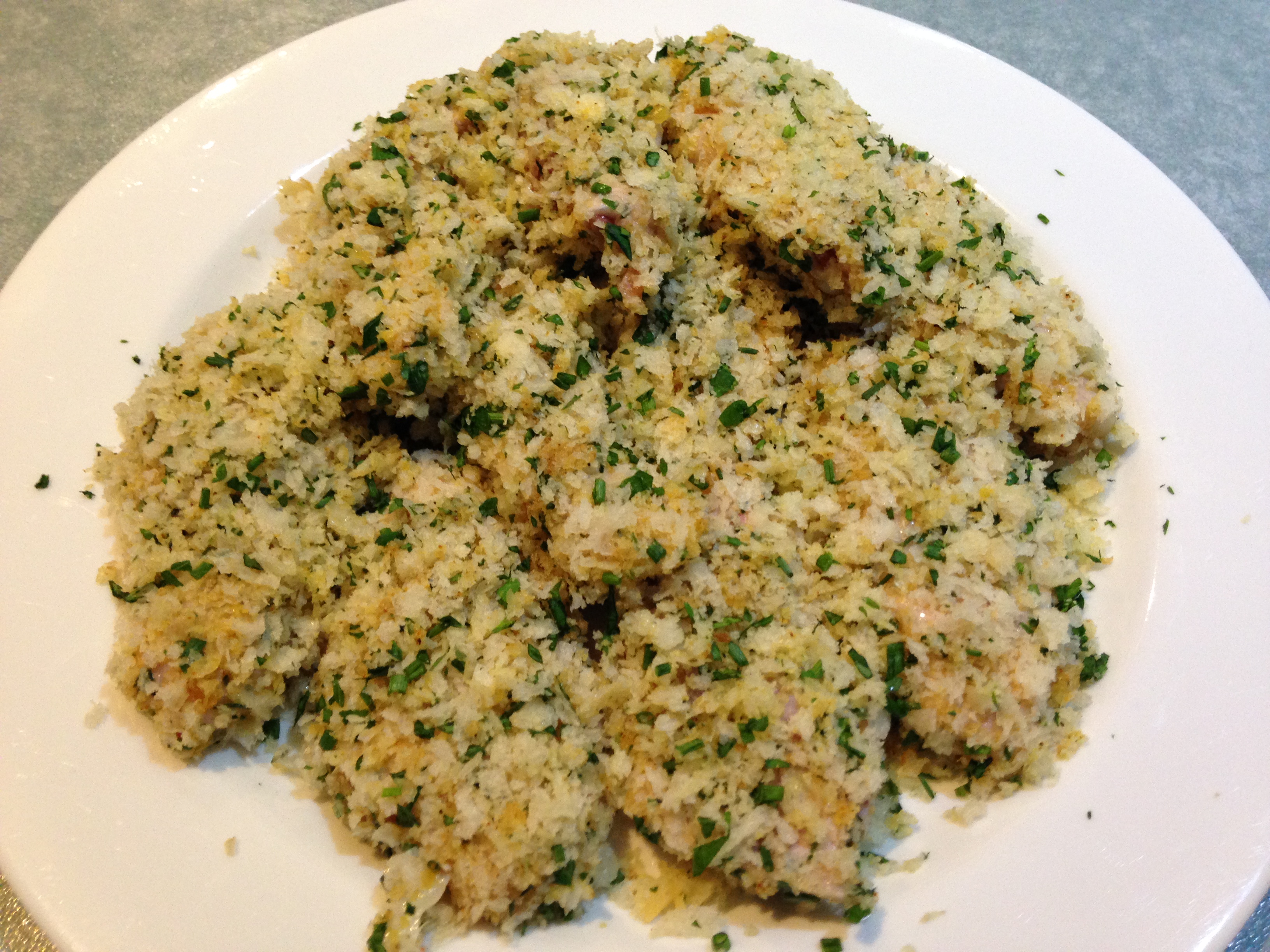 We began with two or three cloves of garlic, mashed to a paste by Maggie with the tip of a bread-and-butter knife (subsequently replaced with a garlic grater received as a Christmas present!). We added dry ingredients to the paste – cayenne pepper, black pepper and chicken stock powder; we often use the last as a flavouring but not as a stock substitute. Then we used a spoon to gradually disperse the paste through some breadcrumbs, adding extra crumbs as we went. Once the garlic was well integrated with the crumbs, we added some finely chopped parsley and chives, then some olive oil and a few more breadcrumbs.