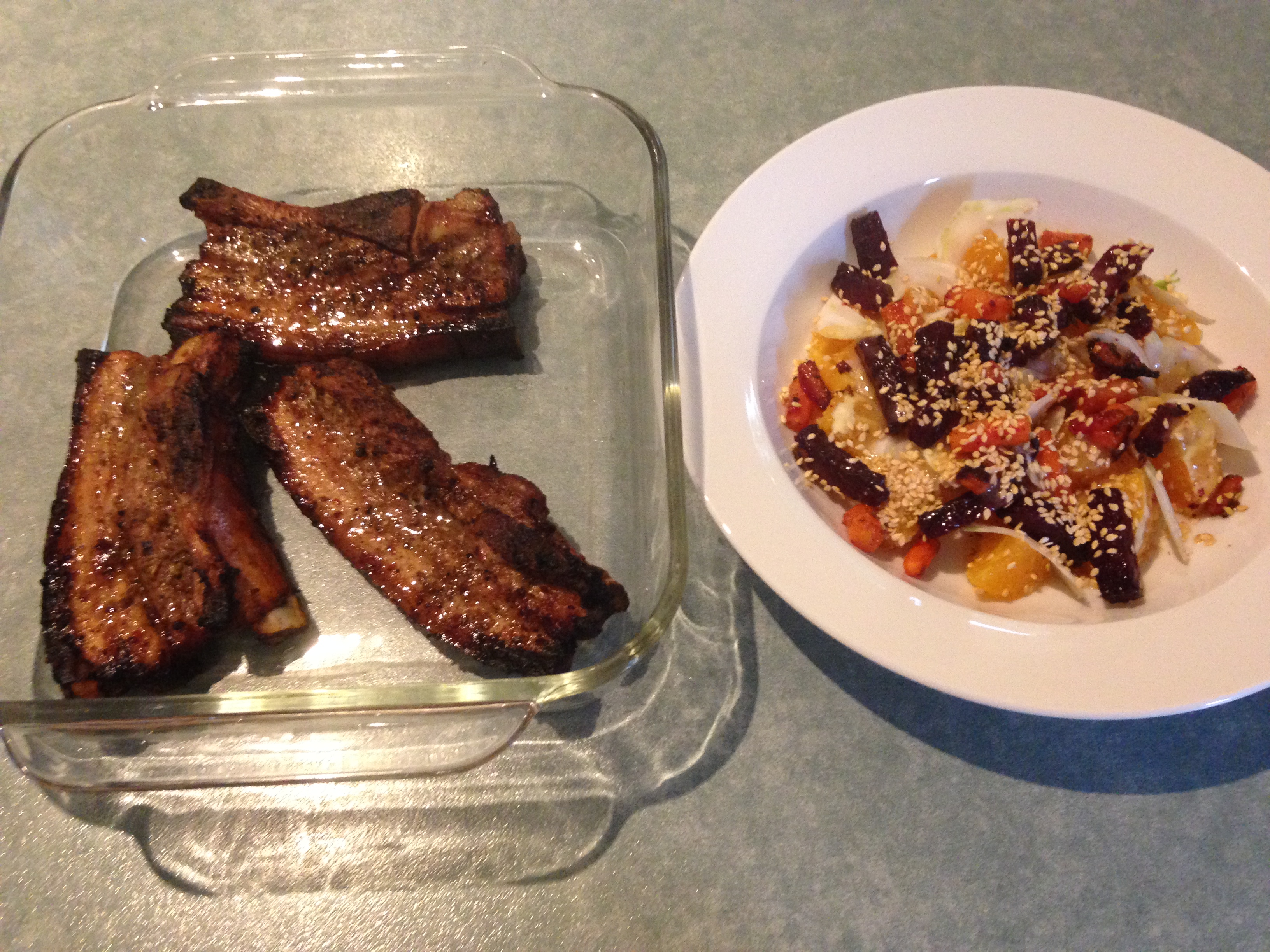 Last night’s dinner was tasty and refreshing – Weber-roasted pork ribs; a salad of orange, fennel, sesame seeds, carrot and beetroot; and some Basmati rice.