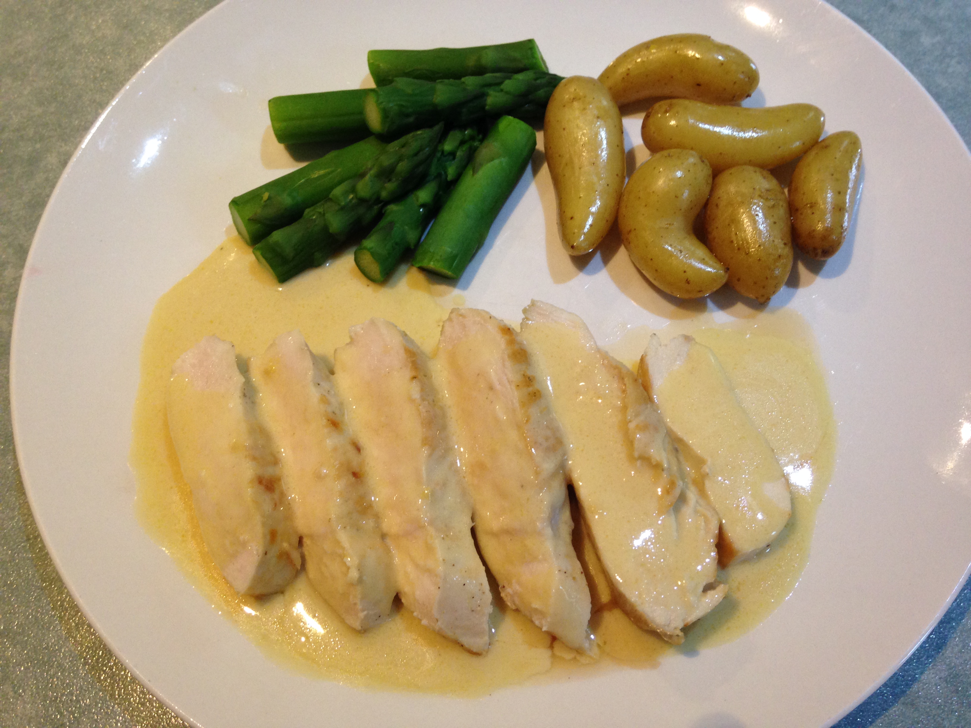 - We serve the chicken with gently boiled kipfler potatoes and a green vegetable, eg wilted spinach, beans or, in season, asparagus.