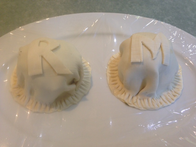 Maggie then added puff pastry initials to each piece and brushed the finished product with the egg wash.