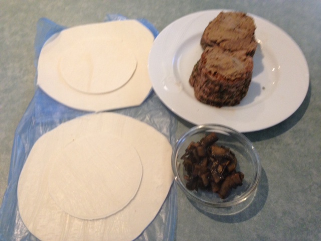 Firstly, Maggie cut the beef into two portions and briefly seared the rare surfaces in a non-stick pan. 100g of Swiss Brown mushrooms were sliced then sauteed in butter in the same pan until quite soft. Meanwhile, Maggie cut out four discs of puff pastry, two smaller ones for the bases and two for the caps.