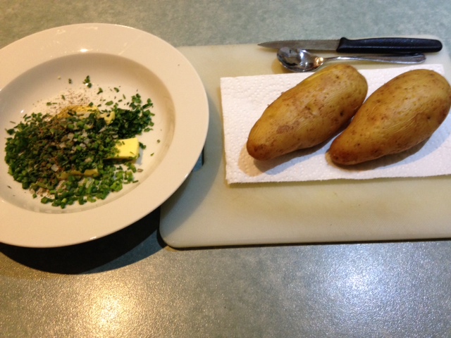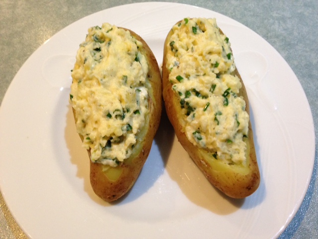For the stuffed potatoes, I pricked the skin of each potato thoroughly with a fork – to prevent a premature eruption of potato flesh – and boiled them gently for about 25 minutes (must be no longer than when the skin just begins to peel). When they were cool enough to handle – don’t use cold water, let them continue to cook in their own skins – Maggie sliced off a thin top layer, scooped out most of the flesh and mashed it with some butter, sour cream, salt, black pepper, paprika and plenty of finely chopped parsley and chives that I picked from our garden.