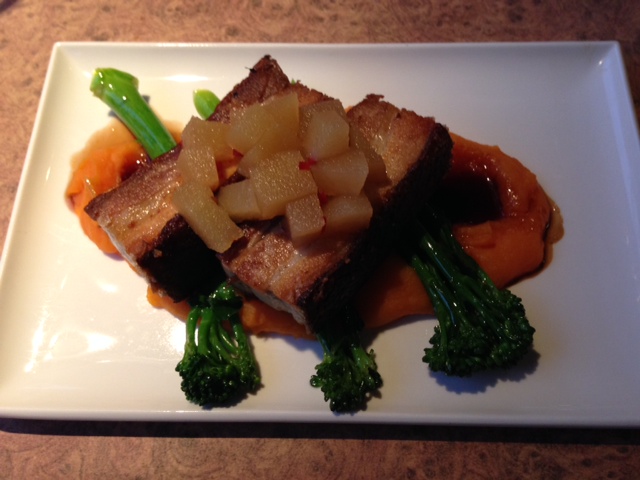 For dinner, we ate at the hotel again; we had seen evidence that there was some skill in the kitchen. Maggie chose a dish of twice-cooked pork belly, with a fruity jus, al dente pieces of apple and broccolini. For me, it was an opportunity to have some fish without being required to negotiate with Maggie to make room on our domestic menu! On this occasion, it was a generous serve of Barramundi, one of my favourites, accompanied by a medley of Mediterranean vegetables and a dollop of skordalia. Both dishes would have found favour with the legion of food critics based in Melbourne.