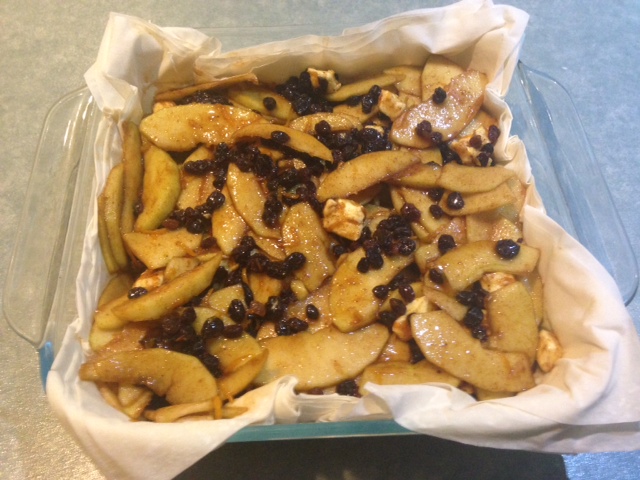 - Add apple mixture to the baking dish and spread evenly.
