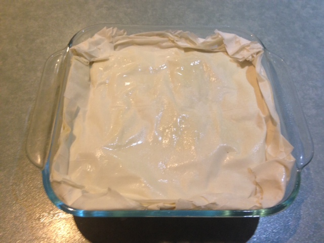 - Line a 20cm x 20cm baking dish with six (6) sheets of the pastry, as follows: place first sheet flat on bench, spray left-hand third lightly with olive oil, fold to lie on top of middle third, spray balance of sheet; place second sheet on top of first sheet with right-hand third overhanging, spray the overhang, fold in and spray balance of sheet. Repeat twice to produce an approximate square, 9 sheets thick (do the math!). Lift sheets into baking dish and push filo edges against the four sides.