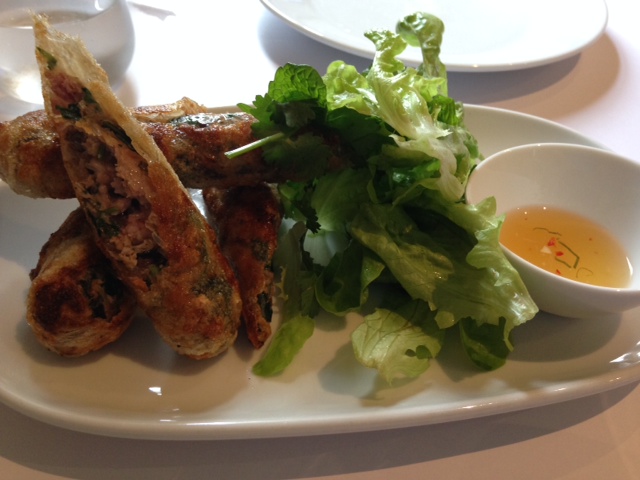 Nen Ha Noi (Hanoi spring rolls), followed by Diep nuong hanh va ra thom (spiced scallops with shallots & herbs)