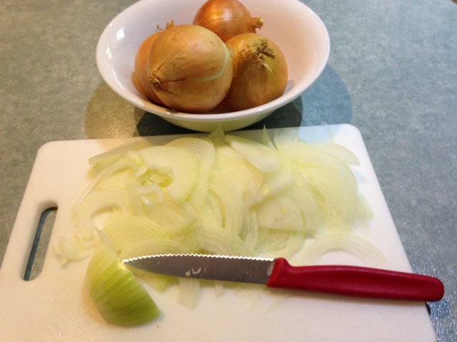 - Peel and halve onions and cut into fine slices, discarding any woody cores