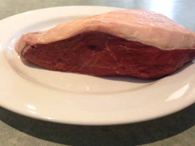 So, we were happy with the outcome, we had already made some minor modifications to the recipe and we’ve identified some further changes for our next attempt. We have also decided that, for a dinner shared with friends, we would use two pieces about the size we obtained from our butcher; the smaller piece took less time to cook than the recipe advised. This afternoon, I have deglazed the cold leftover liquid and boiled it down to about two-thirds of its volume, producing a pleasant beef stock for future use.