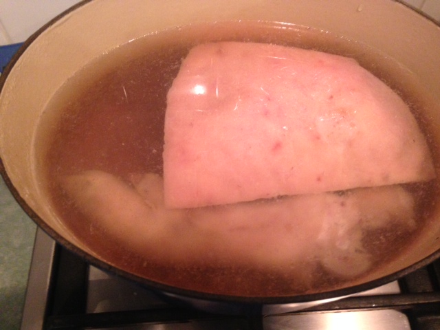 We put a generous amount of boiling water in our Le Creuset pot and added the tip and the trotter. Once they had simmered for about 15 minutes, we added the other ingredients, brought it back to a simmer, put the lid on and placed the pot in an oven heated to about 140C. The temperature has to be such that the liquid barely bubbles.