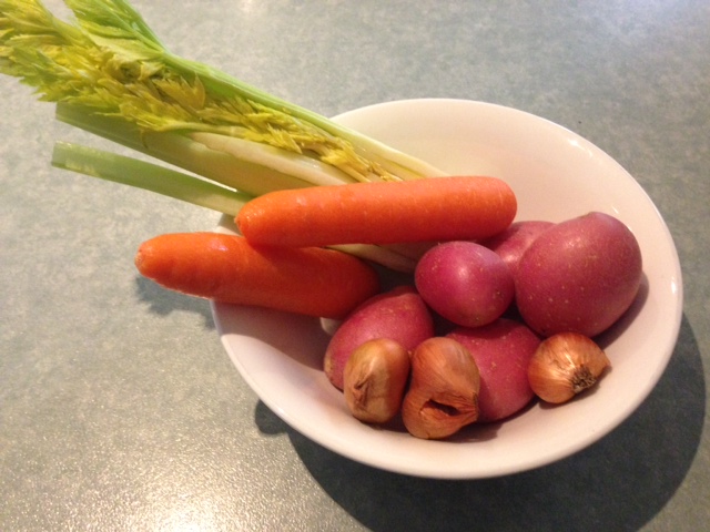 After no more than an hour, we took the pot out of the oven, removed the meats and strained the liquid through a colander and then through a fine sieve.The beef was returned to the pot, along with the strained liquid, and brought back to a simmer. We then added pieces of peeled carrot, a trimmed celery heart and peeled (French/brown) shallots, brought it back to a simmer and returned it to the oven. 20 minutes later, we added some small, whole Desiree potatoes. The recipe said to peel the potatoes; we left half of them unpeeled and, based on the result, would not peel any of them next time.