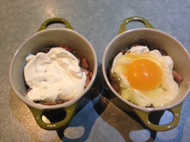 Maggie distributes the mixture between three or four cocottes – this is a method, not a recipe – and covers it with a tablespoon or so of (light) sour cream (creme fraiche). Then she cracks a fresh egg into each cocotte and drizzles each one with some cooking cream.