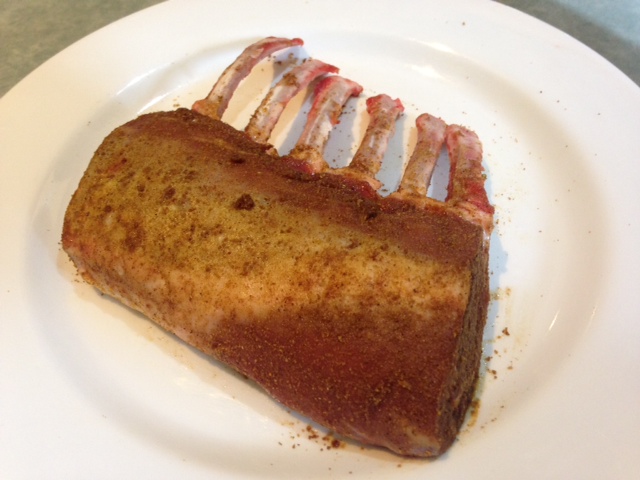 The second rack was purchased at Ashburton Meats, our preferred supplier of beef, lamb and pork. We prepared this 6-point rack by applying an Indian spice rub the day before we cooked it. Meanwhile, I cooked some palak, the Indian dish made from spinach. Then, while the lamb was roasting, I made a spicy rice pilau, combined some yoghurt and chopped mint in a small dish and heated some naan bread in the electric toaster.