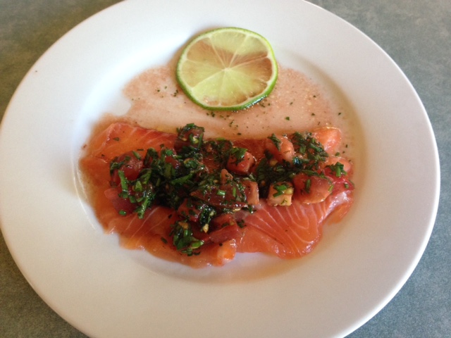 No matter. The next small plate packed plenty of wow – salmon carpaccio with a tomato, herb and lime salsa. We have made this many times before but this was our best-ever rendition; Julian and Sara both had second serves.