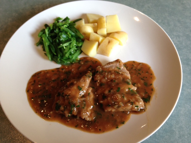 So, working backwards, we looked for the first dish we would prepare and plate up and let it point us to a sauce recipe. We went to the section of escalopes de veau recipes, found one that included a sauce flavoured with tarragon – currently abundant in our kitchen garden – and that took us to brown sauce (1) (there are three versions of brown sauce and at least 10 further variations).