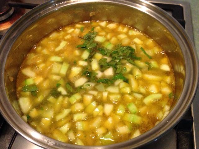 - Add the spices, stir to combine with the onion and add the cucumber. Cook for 5 minutes, add the stock, dill (or mint) and lemon zest, bring to the simmer and cook for 10 minutes.