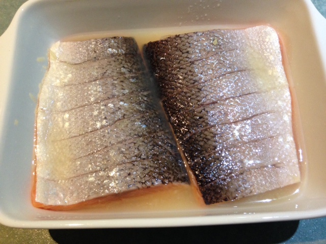 - Score the salmon skin with a sharp knife at 2cm intervals and place the fillets in the lemon juice for 15 minutes, turning after 10 minutes. Remove fillets, pat dry with paper towel and season with a little salt and pepper.