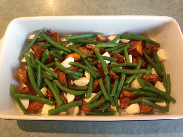 The side dishes included a couple of the usual suspects and a room-temperature salad, comprising: small skin-on pieces of roasted pumpkin, tossed in baharat an hour before being slowly roasted with some olive oil; green beans, blanched for just under three minutes and cut in half; pieces of bocconcini, tossed with the warm pumpkin to soften them; and a light dressing of homemade vinaigrette.