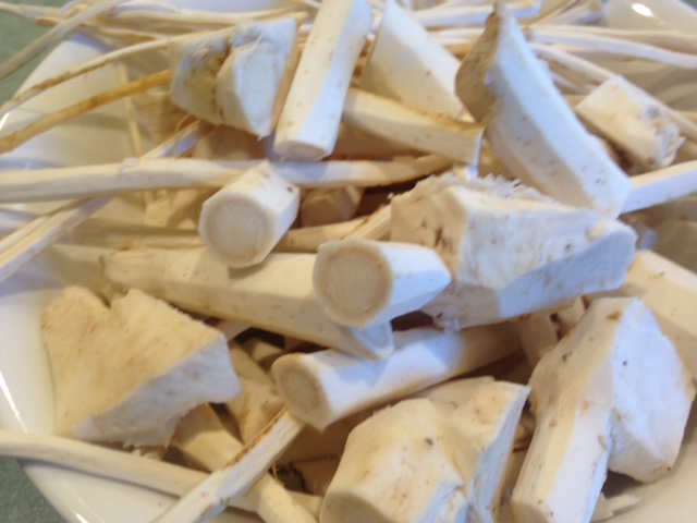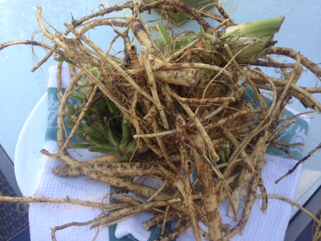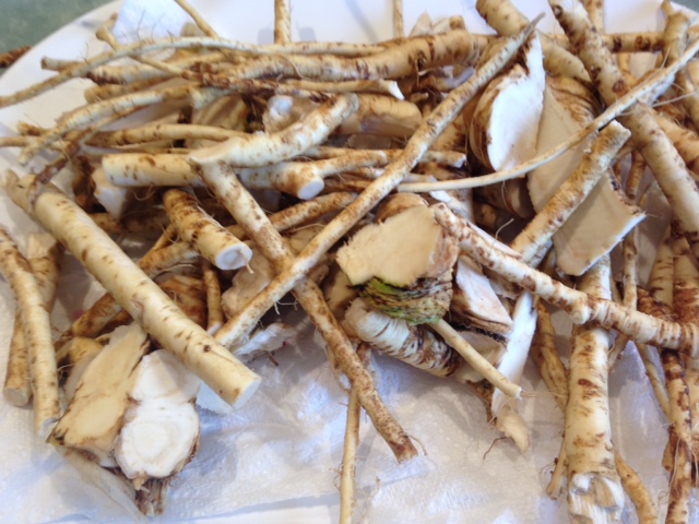 Once I had finished digging, Maggie took the harvest of roots and crowns, washed them a couple of times, drained them on some old towels, put the crowns aside for replanting and peeled and cut the roots in readiness for her to process through our electric mincer.