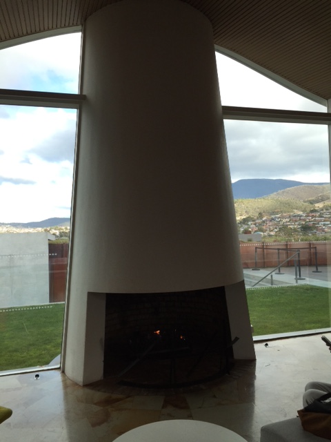 To reach MONA, most visitors use the museum’s own ferry service, which takes about 25 minutes to complete the journey up the Derwent River from its dock at Hobart. After you alight from the ferry, you have to climb 100 steps to the top of the hill on which MONA sits, and when you enter the museum you come upon the aforementioned fireplace.