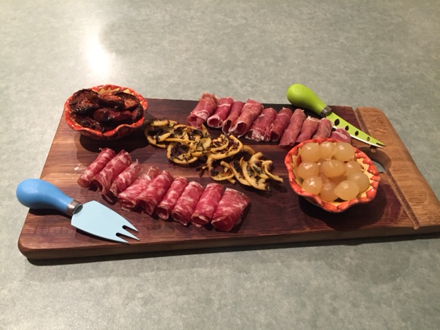 To kick off the evening with the appropriate fanfare, we had served antipasti and some Yarra Valley bubbly. The antipasti comprised: four items from our favourite delicatessen, Stocked – prosciutto, sopressa salami, pickled cocktail onions (amazing) and Persian feta; some pieces of oven-crisped sourdough; and two homemade items – semi-dried tomatoes scented by our basil-infused olive oil and pieces of roasted lemon.
