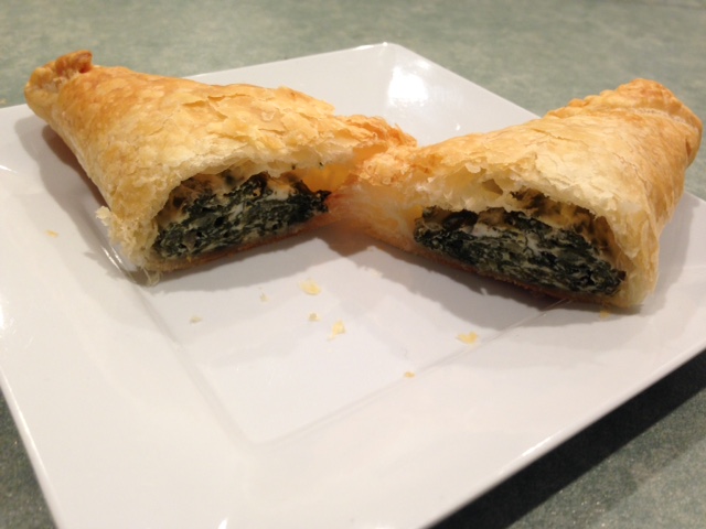 Here is the end result of my ploy – puff pastry turnovers filled with a simplified version of my filo pie recipe and with the tempting texture of the puff pastry. We made them on Sunday afternoon and Maggie took two to work for lunch on Monday. Mission accomplished!