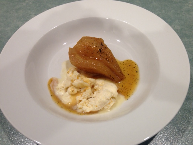 On the evening when we served the roast chicken to ourselves and two friends, we also served a dessert of baked pears, using a modified version of the recipe I posted a couple of years ago. This time, I heated the orange juice in a small pan and added a medium pinch of saffron threads and, off the heat, let the colour bleed out for about 20 minutes. Then I passed the saffron-infused juice through a coarse sieve into a pouring jug, added the brandy and poured it carefully around the pieces of pear which Maggie had prepared and placed in the baking dish. The end result was delicious, with the saffron adding a pleasing touch of complexity.