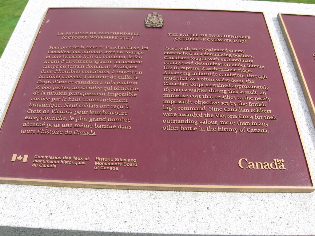The words on the plaque read: “Faced with an experienced enemy, entrenched in a dominant position, Canadians fought with extraordinary courage and determination under intense fire to capture Passchendeale Ridge. Advancing in horrific conditions, through mud that was often waist-deep, the Canadian Corps sustained approximately 16,000 casualties during this assault, an immense cost that testifies to the almost impossible task set by the British high command. Nine Canadian soldiers were awarded the Victoria Cross for their outstanding valour, more than in any other battle in the history of Canada.”