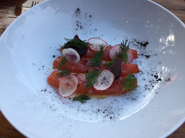 We each selected one appetiser and one entree. Maggie began with cured salmon, pickled beetroot, dill and radishes, a delicate and delicious plate for the ‘knock-the-door-down’ price of $10. For one dollar less, I had a more robust combination of sobrassada, white anchovy, pickled eschallot & crisp toasts; something out of the norm for me and perhaps a little salty, but partnered well by a glass of rose.