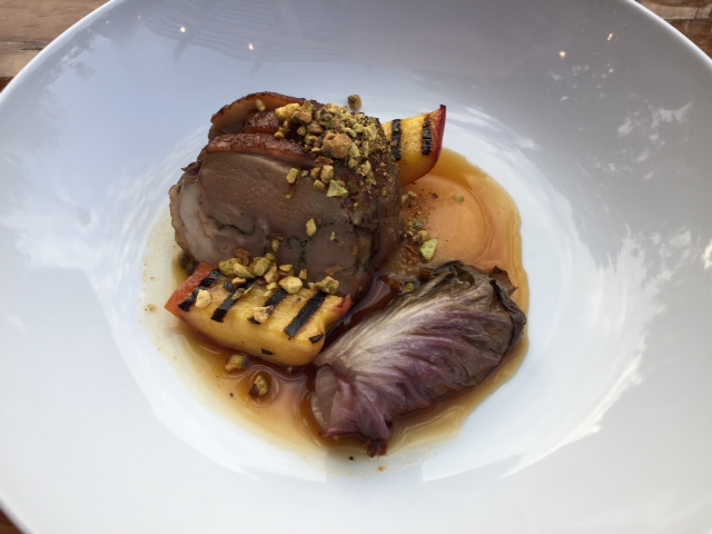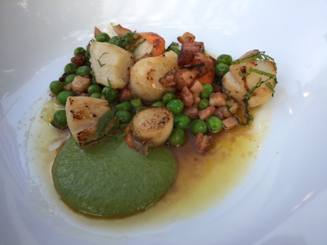 Maggie’s second plate was adorned with roasted duck breast – oh there’s a surprise! – charred peach, radicchio, pistachio and a not-too-sweet orange caramel; close to perfection for a mere $20. For one dollar more, I received a plate of bona fide perfection – pan-fried Tasmanian scallops, sauteed peas, mint, bacon and pea puree. If I have ever been served a better dish of my favourite seafood, it was too long ago to matter.