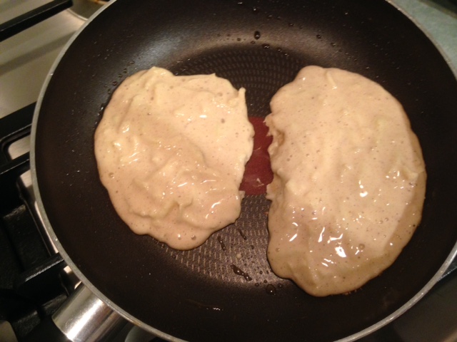 - Warm a non-stick frying pan over medium heat and melt a little butter. Drop large spoonfuls of batter onto the pan and flatten with the back of the spoon. Cook until golden brown on the bottom, just over 2 minutes, then flip and cook for another minute or so.