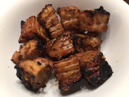 Last night, we cooked ourselves some cubes of pork belly, flavoured before grilling with a spicy paste. It was delicious and here is how we did it.