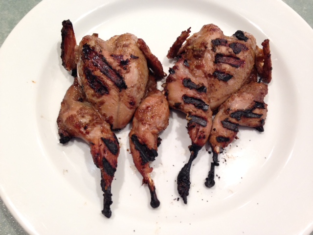 We have modified the cooking method too. We prefer to cook the quail for 4 minutes skin-side up, 3 mins skin-side down, then a further 1 min skin-side up. In our Weber Q, this sequence ensures that the skin becomes attractively charred, with minimal loss of skin from sticking to the grill.