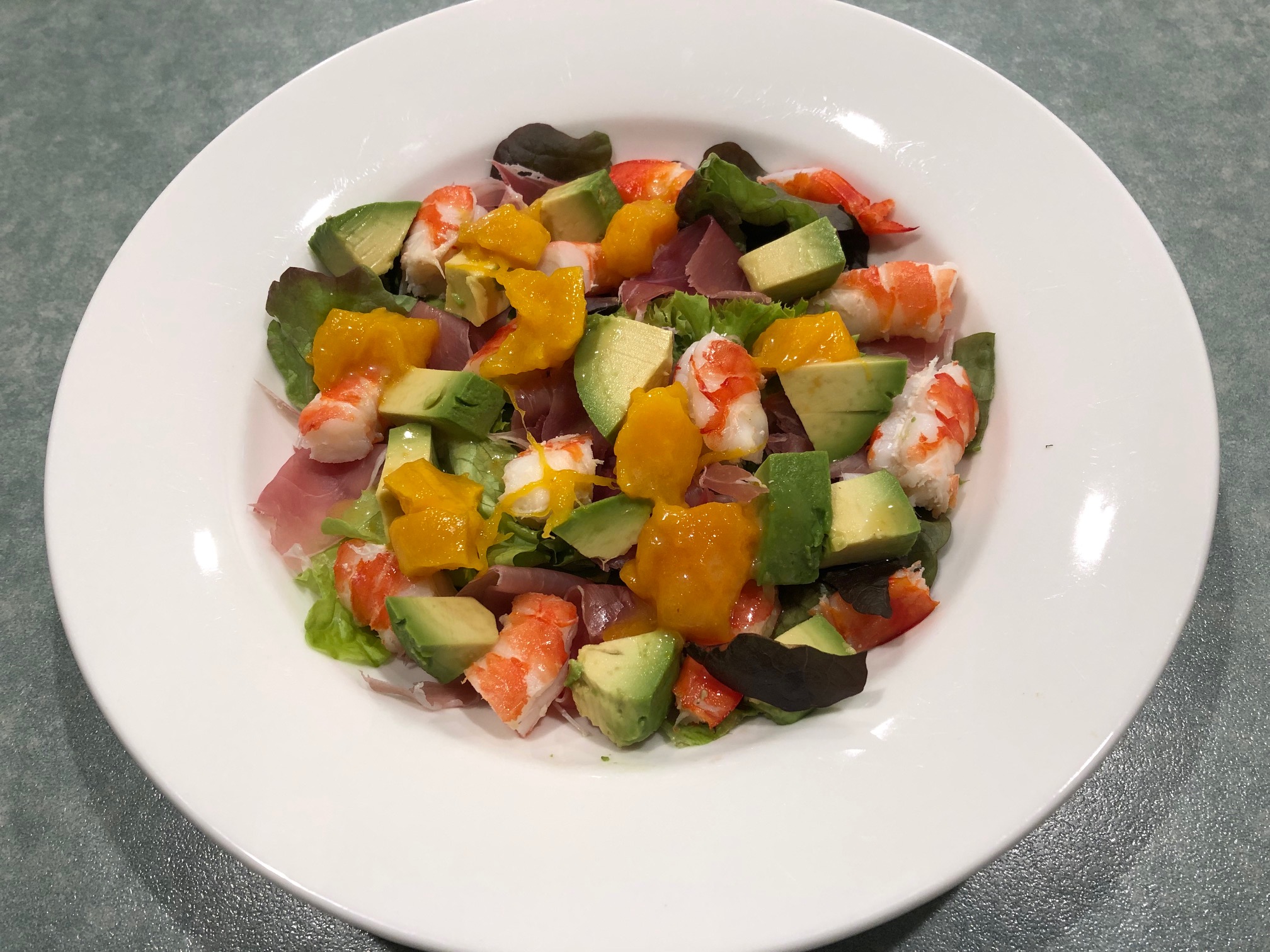 We have also used the mango in a salad of poached chicken, prosciutto, avocado and green leaves; almost as delicious! And here is a plate of our prawn salad, with tomato replacing the caramelised mango