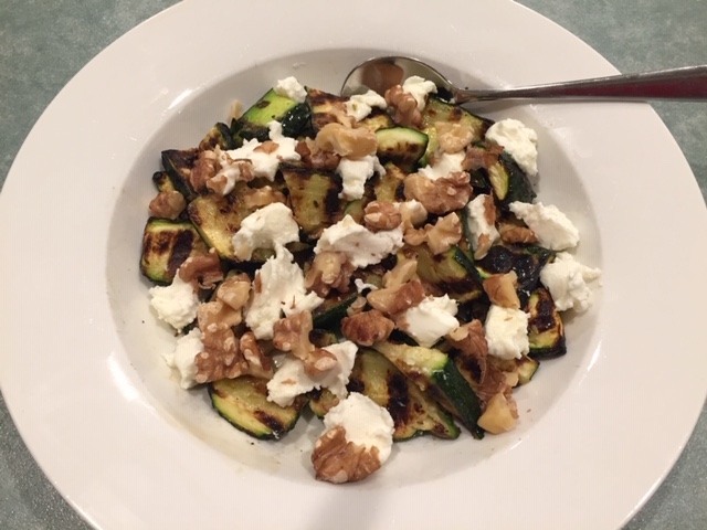 The first is to cut your zucchini slices into shorter lengths and toss them with pieces of toasted walnut and small pieces of soft feta, also known as Persian feta. No further dressing required.