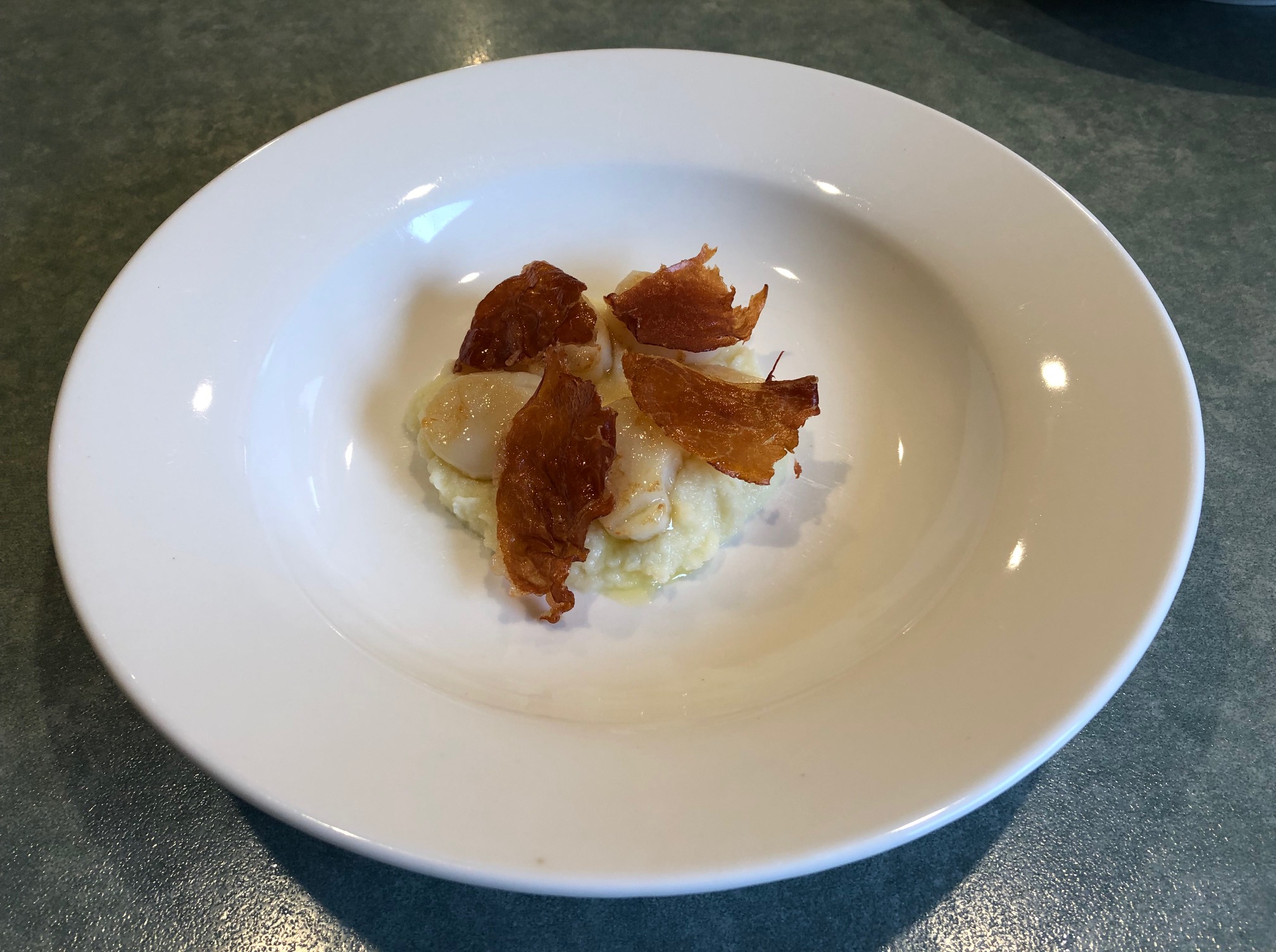 We spread a generous spoonful of the puree on the base of a warmed bowl, topped it with some of the seared scallops and then added pieces of just-crisp prosciutto. The flavours and textures worked together brilliantly!