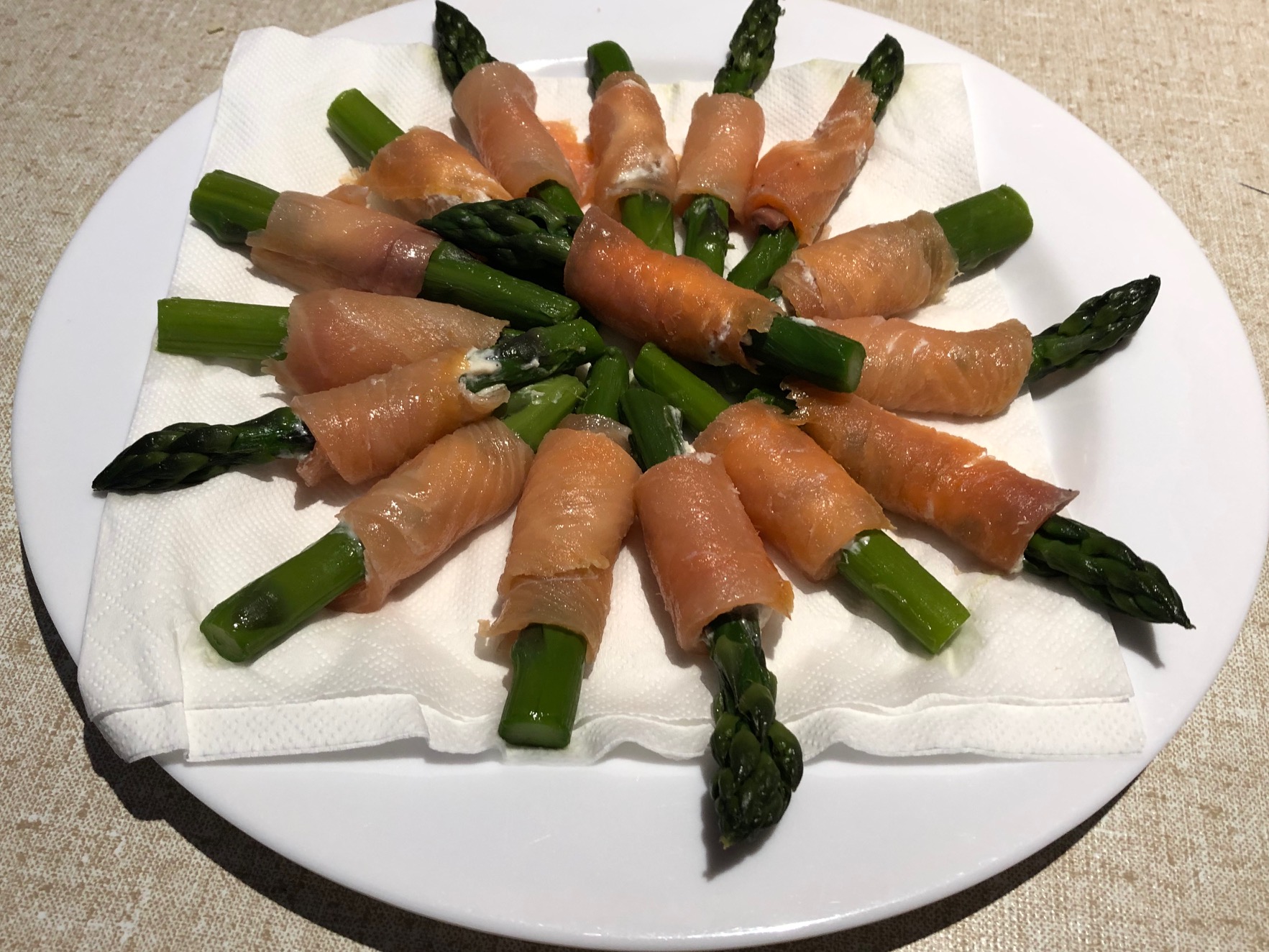 And here is another option for serving cooked fresh asparagus – cooled down in the fridge then wrapped in pieces of smoked salmon which have been smeared with a paste of sour cream, grated horseradish and a pinch each of salt, pepper and caster sugar.