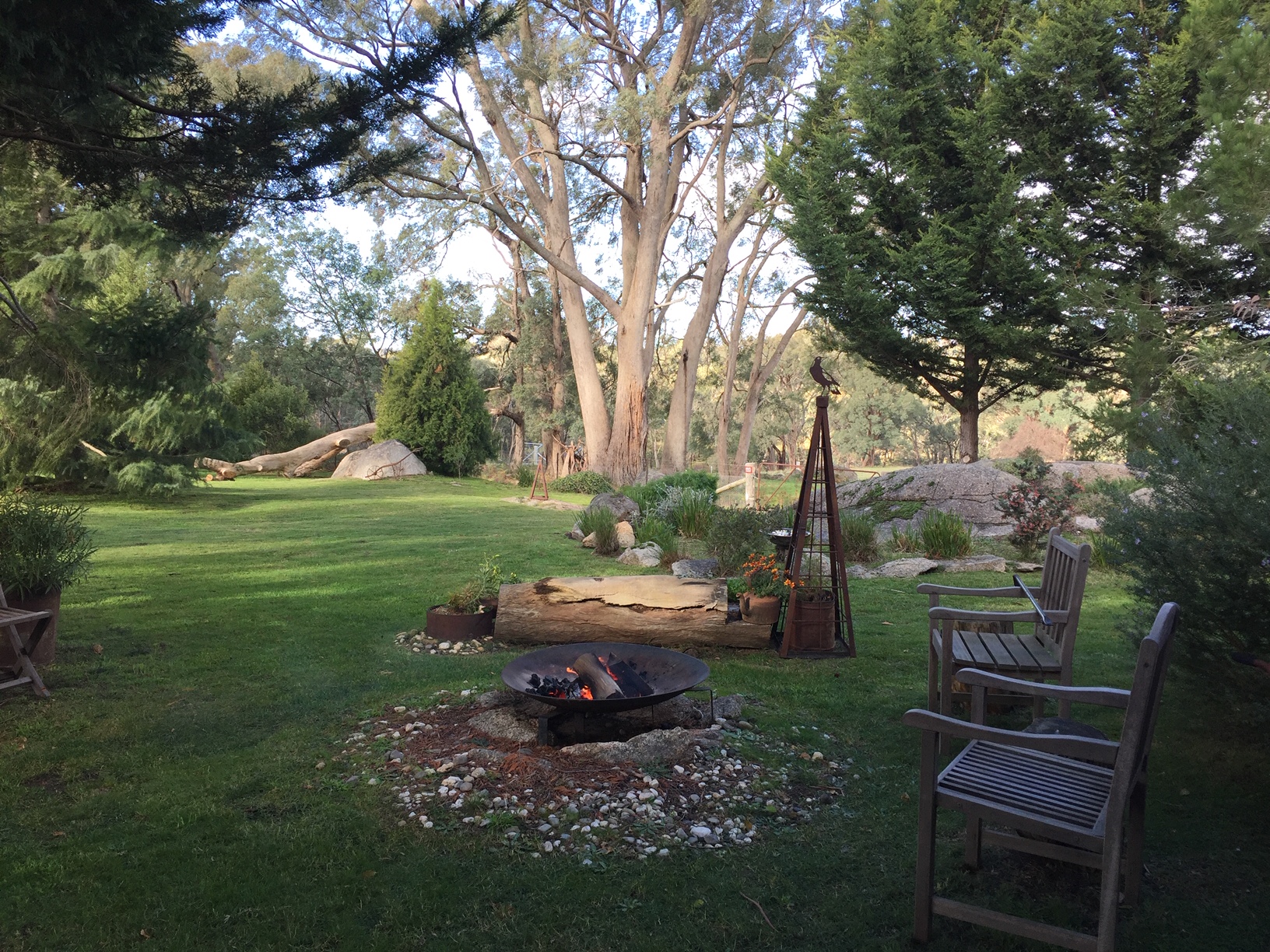 For most of the two-hour journey, we drove through drizzle and rain showers. By the time we arrived at Boondaburra, the sky was clearing but a fresh south-easterly chilled the air. No matter! Our hosts had two fires going, one in a pit close to a sheltered patio, the other warming our comfortable and spacious open-plan accommodation.