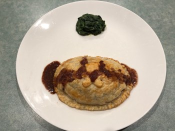 As it happened, Maggie had a couple of sheets of puff pastry lying idle in our freezer, leftover from the pack we bought to make our annual batch of Beef Wellington. Here is how it turned out in 2020, accompanied by a modest heap of wilted spinach.